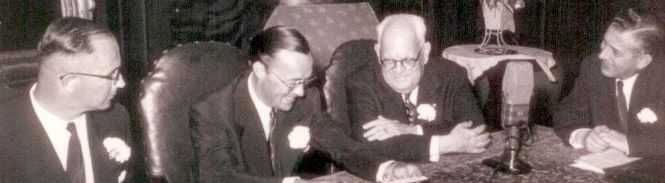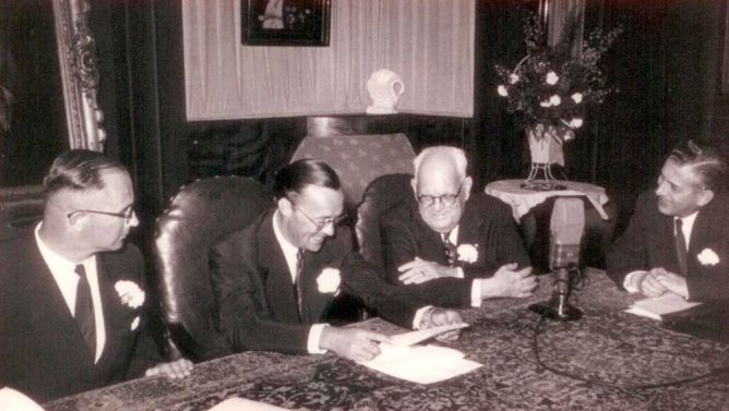 Foto: oprichting van het Prins Bernhard Cultuurfonds Nederlandse Antillen op 7 Augustus 1953; in het midden vlnr ZKH Prins Bernhard en Joseph Alvarez Correa.