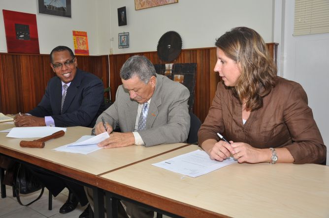 Foto: Moment van ondertekening van de nieuwe statuten op 23 September 2011; vlnr Notaris mr. M. Alexander, Voorzitter PBCCG Winthrop Curiel, Kandidaat Notaris mr. C.A.P. Baaten.